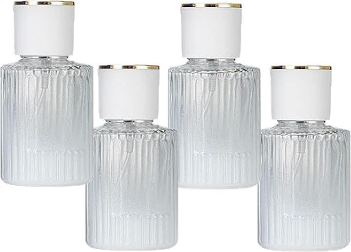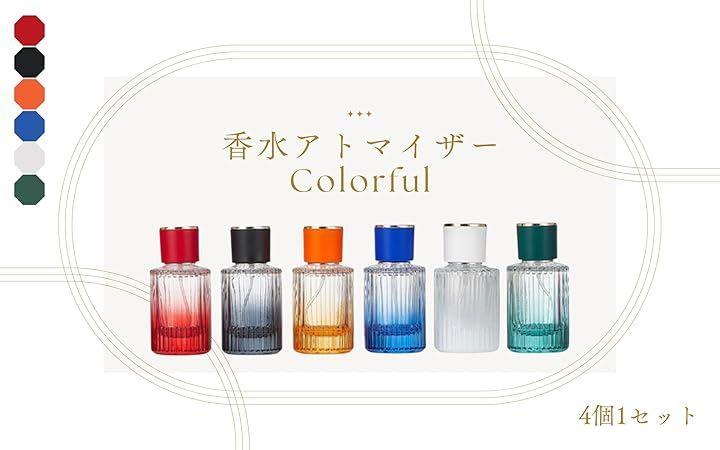 セット内容:各色4本セット(ブラック、ホワイト、ブルー、グリーン、オレンジ、レッド) 材質:ガラス 特徴:コンパクトサイズ 高密閉設計 香り長持ち 透明ボトル 詰め替え可能 用途:香水 化粧水 ヘアスプレー アルコール対応