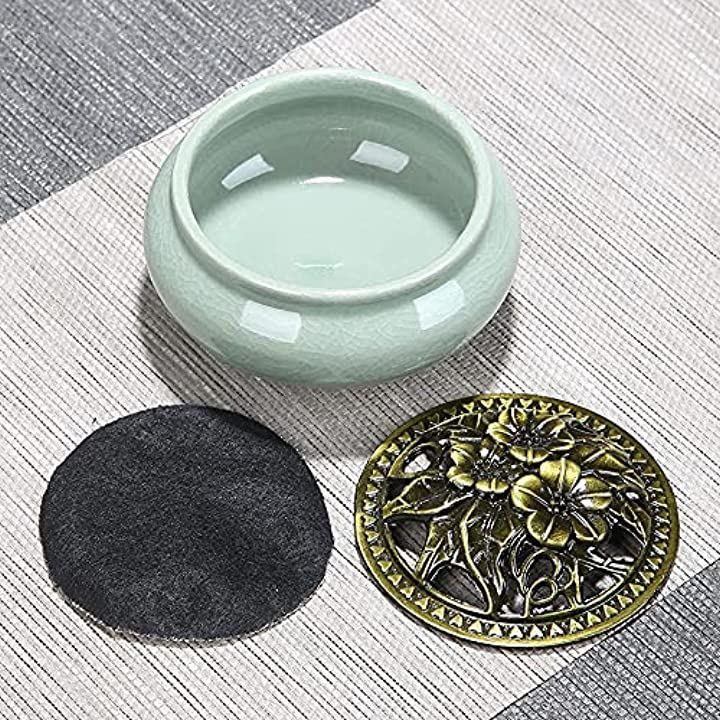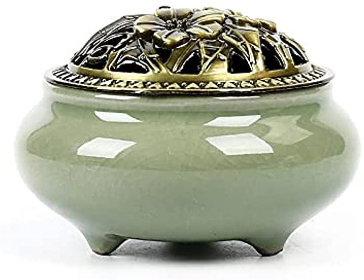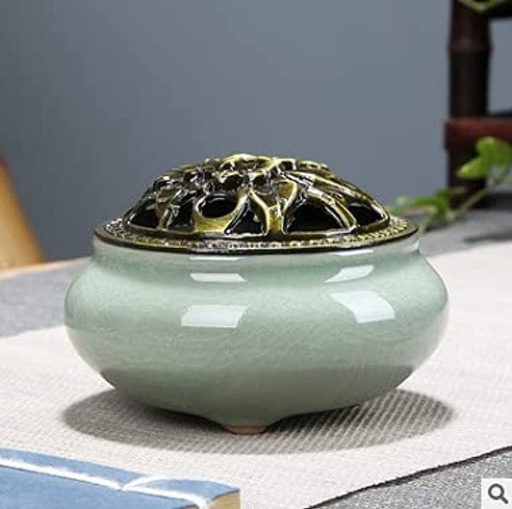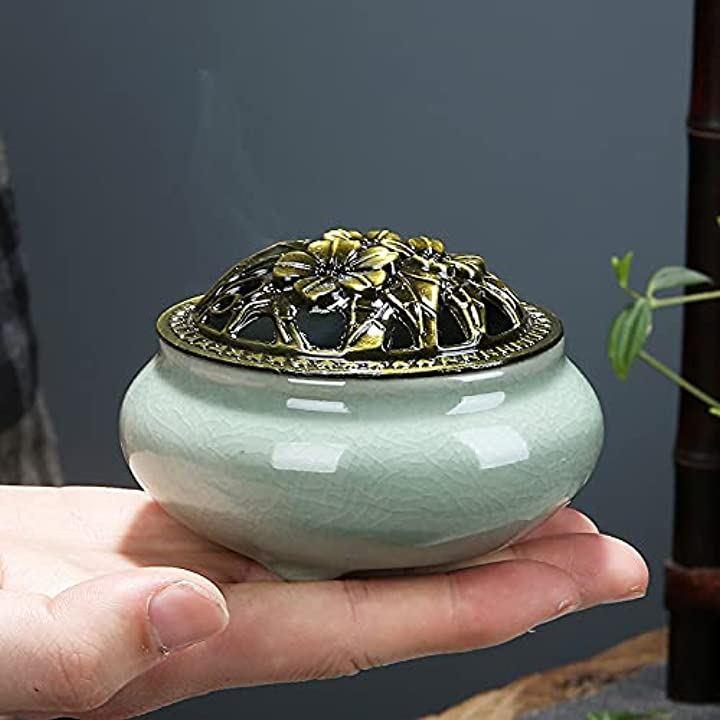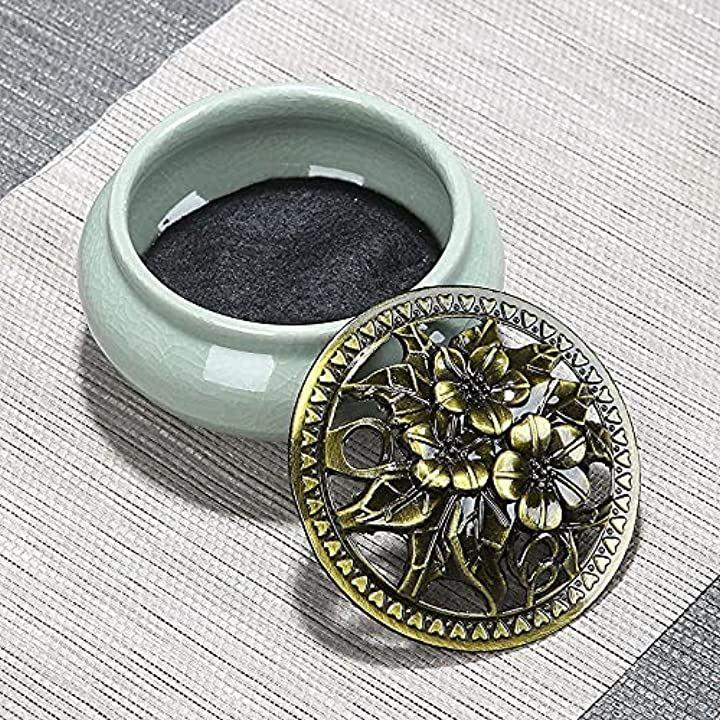 ・心を落ち着かせてくれる色の香炉、古銅色の蓋、香立金具のセットです。