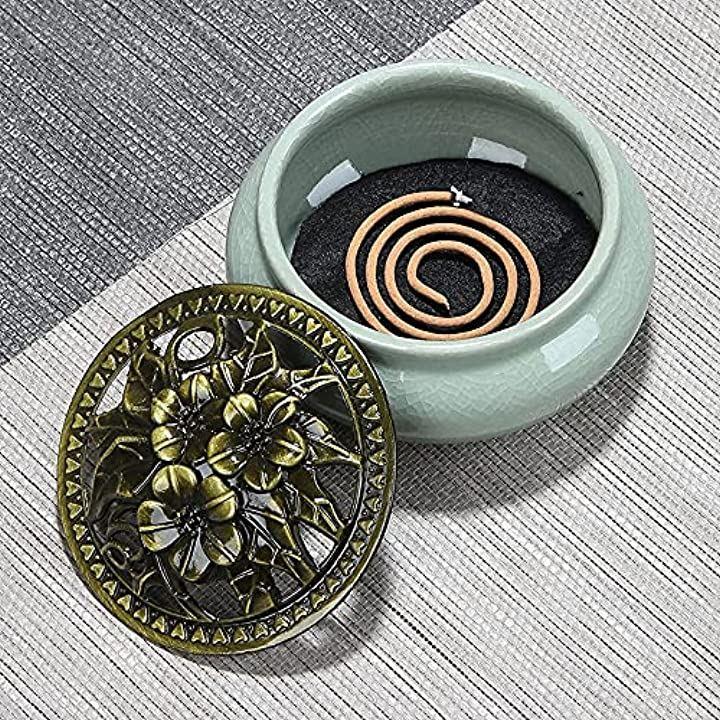 心を落ち着かせてくれる色の香炉、古銅色の蓋、香立金具のセットです。