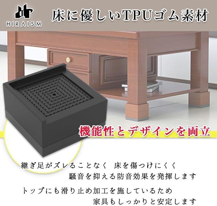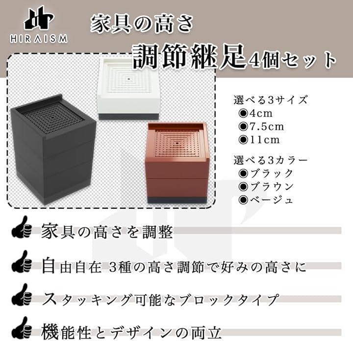 スタッキング可能なブロックタイプで、テーブル、ソファー、ベッド、こたつ、棚など、幅広い家具に適用可能。