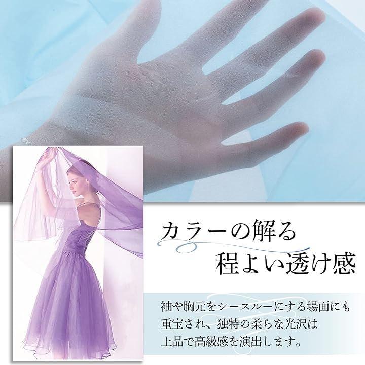 光を通す軽い素材なので、袖や胸元をシースルーにする場面にも重宝され、独特の柔らな光沢感は雰囲気を持ちながらも上品で高級感のあるアイテムを作る事ができます。
