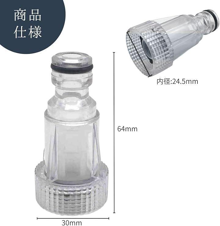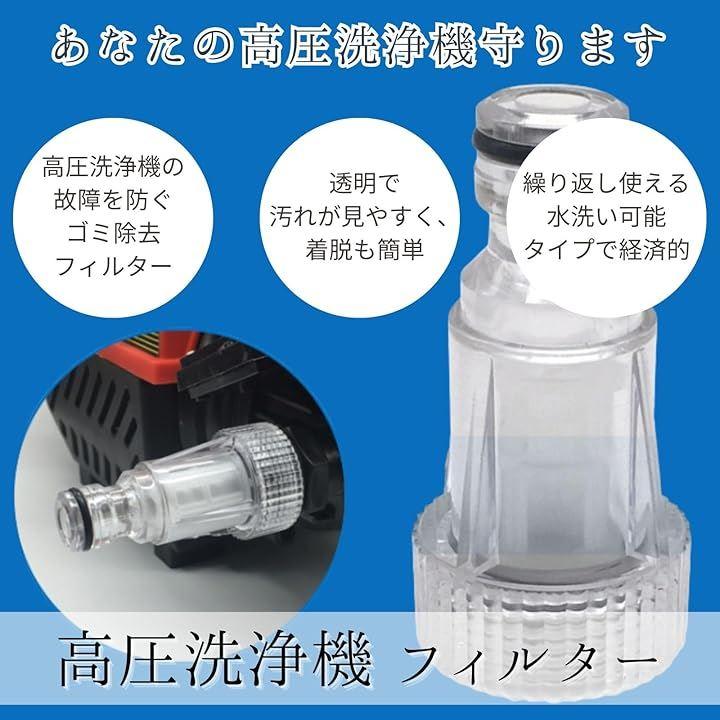 「高圧洗浄機の故障を防ぐゴミ除去フィルター」給水口に簡単に取り付け可能で、水道水や井戸水、雨水などの金属片やゴミの混入を防ぐ。
