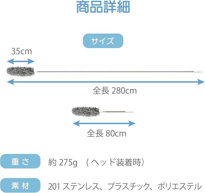 「商品詳細」サイズ モップヘッド:長さ約35cm、幅約14cm スティック(持ち手部分):(伸縮)長さ約45~245cm、太さ約1.6cm重さ:約275g (ヘッド装着時) 素材:201ステンレス、プラスチック、ポリエステル