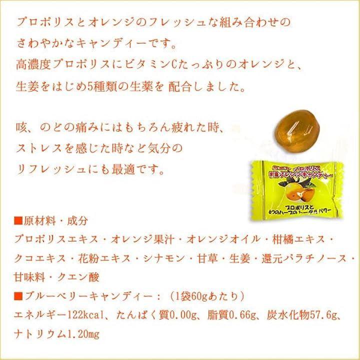 [オレンジキャンディー成分]プロポリスエキス・オレンジ果汁・オレンジオイル・柑橘エキス・クコエキス・花粉エキス・シナモン・甘草・生姜・還元パラチノース・甘味 料・クエン酸