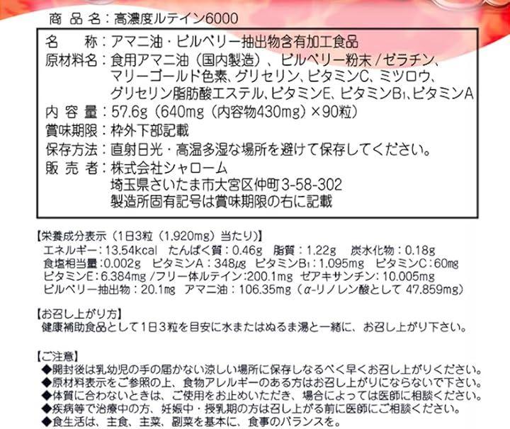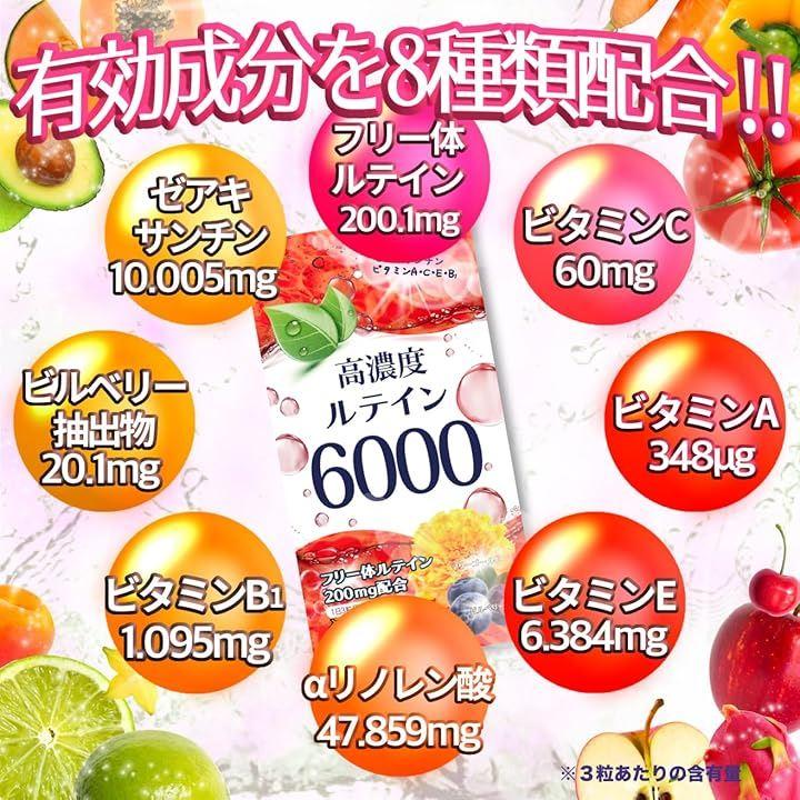 「ルテインだけじゃなくビタミンA・ビタミンB1・ビタミンC・ビタミンEを配合」高濃度ルテイン6000は1日あたり3粒にフリー体ルテイン:200mg・ビルベリーエキス:20mg・ビタミンA:348μg・ビタミンB1:1.095mg・ビタミンC:60mg・ビタミンE:6.384mg・ゼアキサンチン:10mg・α-リノレン酸:47.859mgをたっぷり贅沢配合しました。