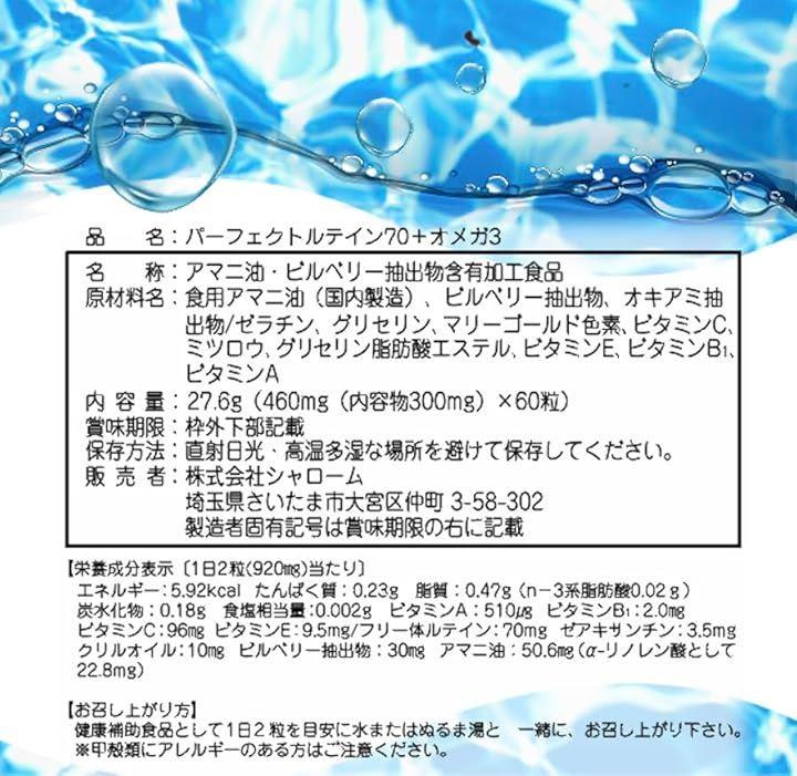 パーフェクトルテイン70+オメガ3は1日あたり2粒にフリー体ルテイン:70mg・ビルベリーエキス:30mg(アントシアニン10.8mg)・ビタミンA:510μg・ビタミンB1:2.0mg・ビタミンC:96mg・ビタミンE:9.5mg・ゼアキサンチン:3.5mg・クリルオイル:10mg・α-リノレン酸:22.8mgをたっぷり贅沢配合しました。
