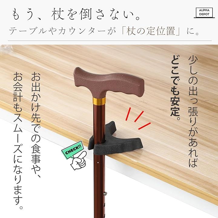 「出先でも置き場に困らない。」テーブルの縁やカウンターなどの出っ張りにサッと掛けてステッキをその場に固定できる便利なホルダーです。