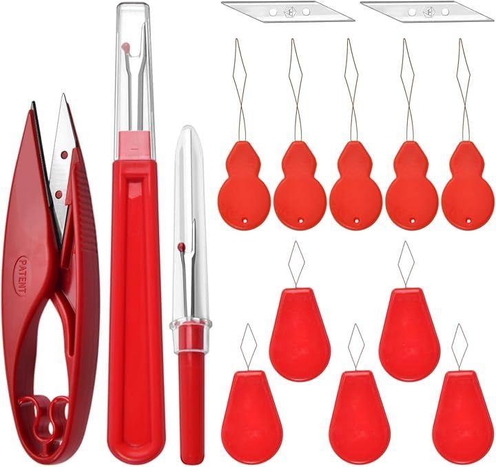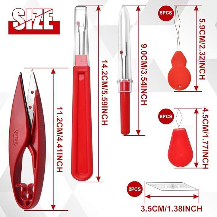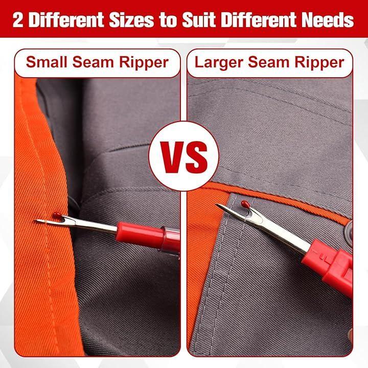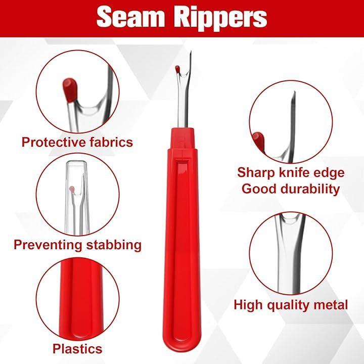 「安全設計のシームリッパーと細目用赤針通し」プレミアム金属とプラスチック製のシームリッパーは、赤い安全チップで生地を保護。