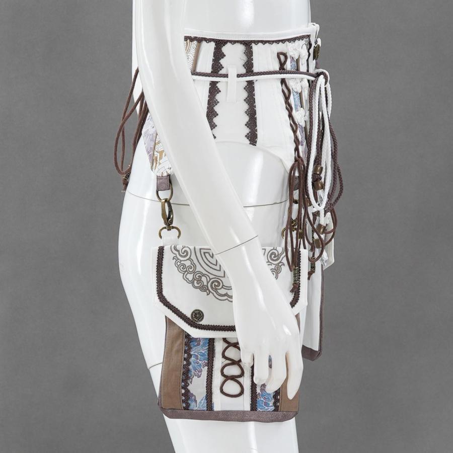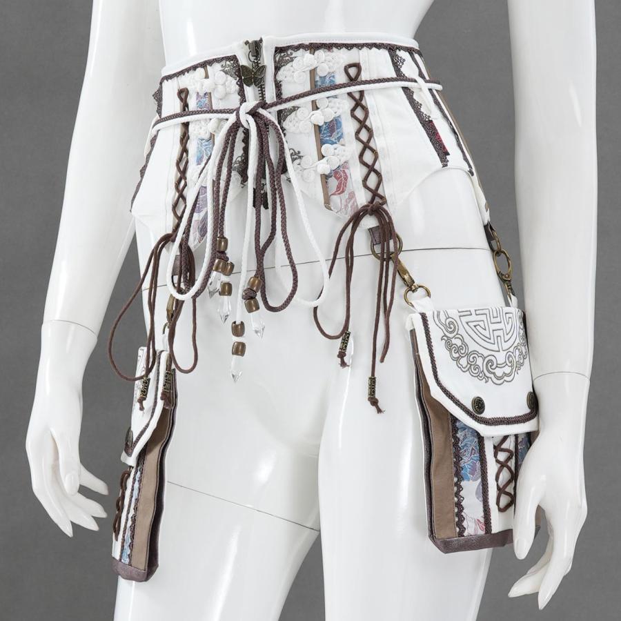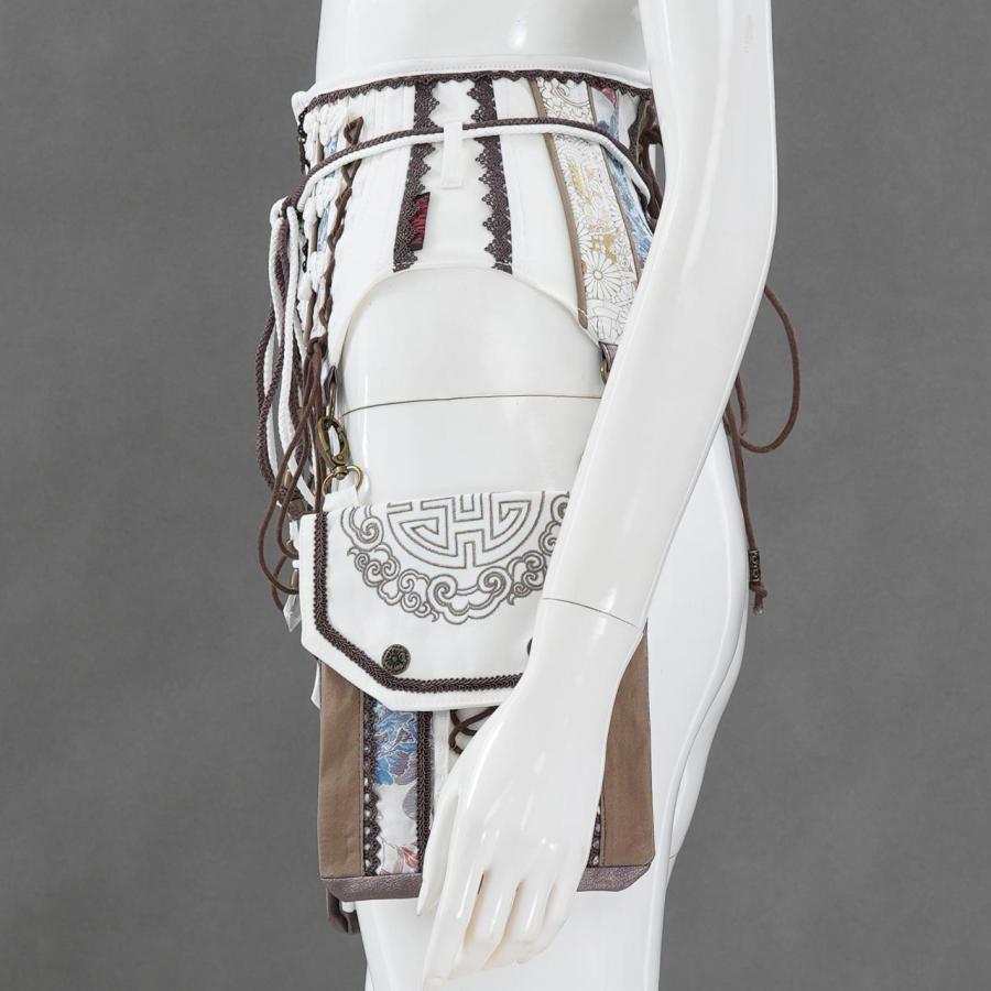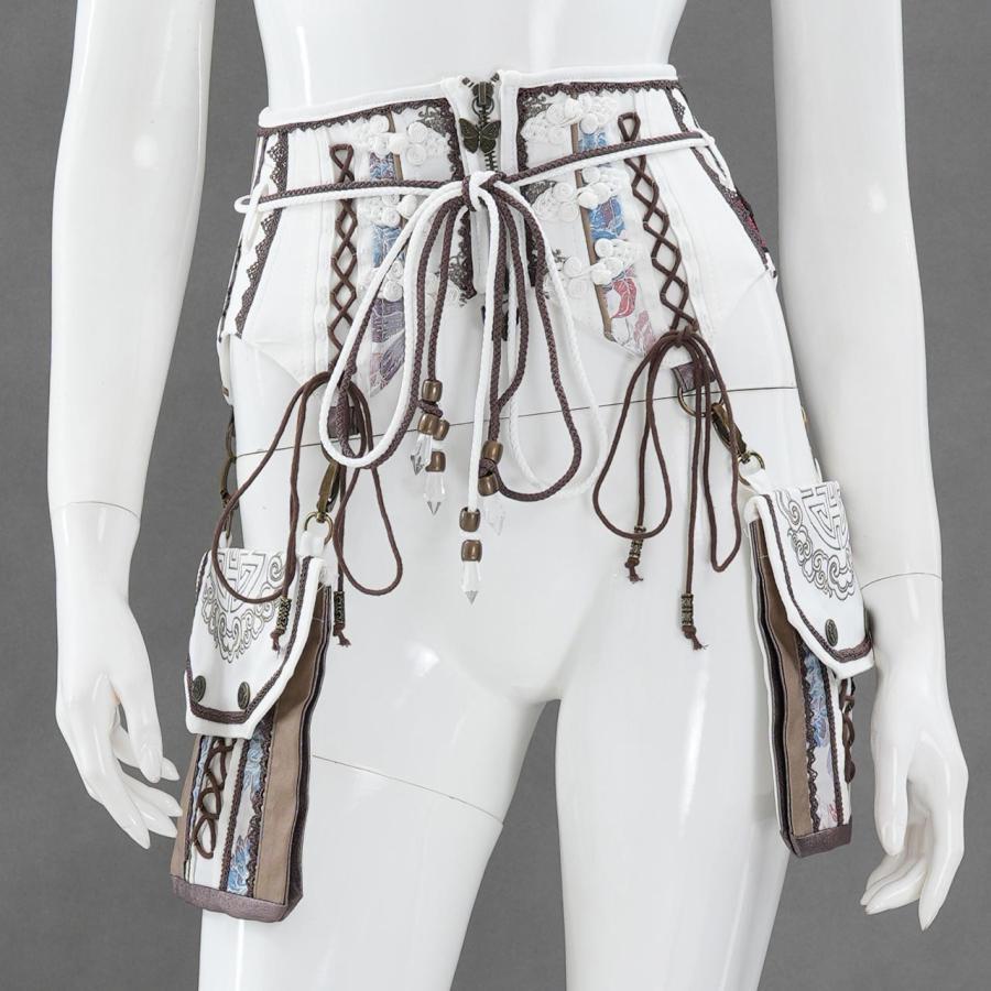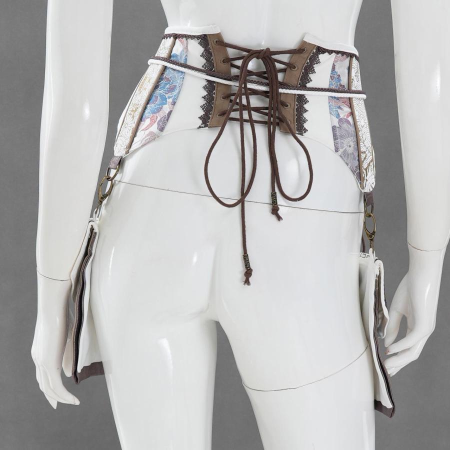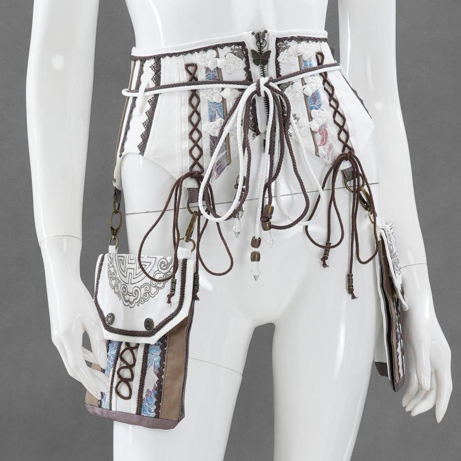 しなやかな曲線美と、繊細な装飾が共存するコルセット。立体的に構築されたボディラインは、ウエストを優雅に引き締めながらも可動性を損なわず、美しいシルエットを描き出します。左右には取り外し可能なポケットポーチを配置し、機能性とデザイン性を両立。チャームやレース、タッセルをあしらった細部の意匠が、洗練された華やぎを添えます。日常のスタイリングにはもちろん、特別な装いにも寄り添うアイテムです。