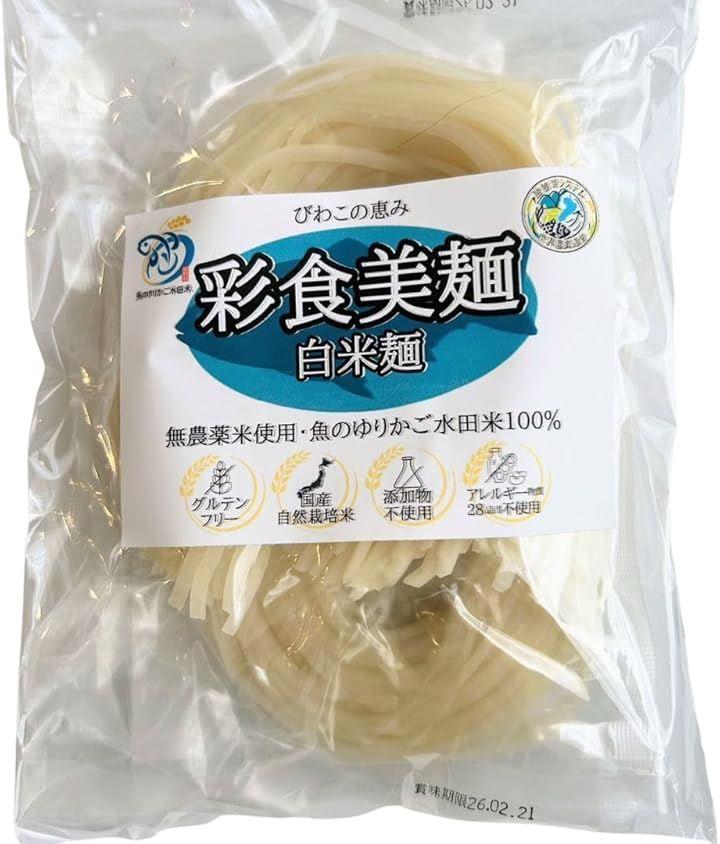 彩食美麺は、滋賀県産 無農薬 近江米 世界農業遺産「琵琶湖システム」の代表「魚のゆりかご水田」のお米から丁寧に作られた、グルテンフリーの半生米粉麺です。