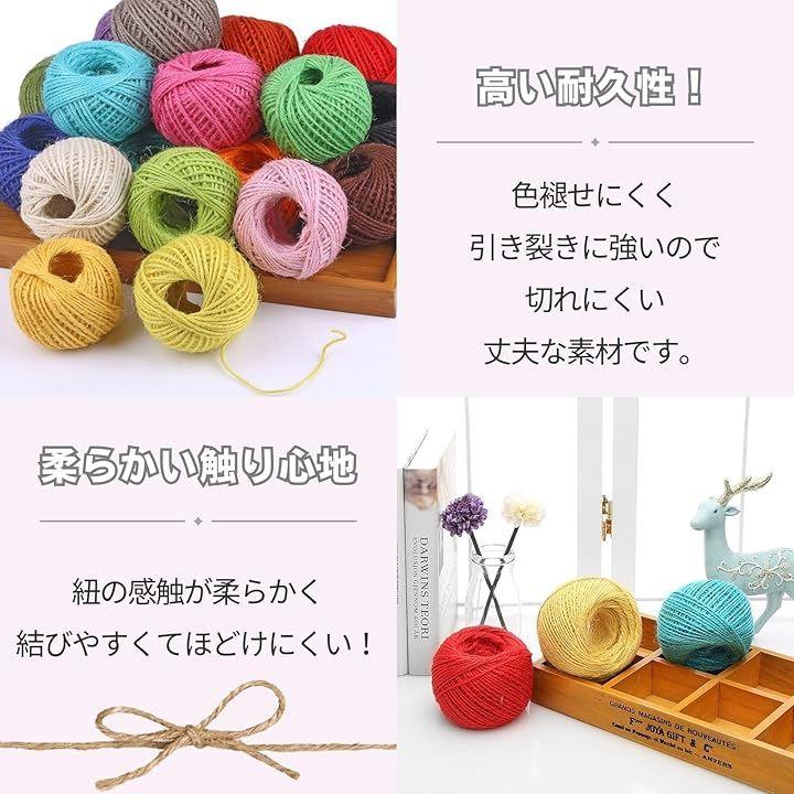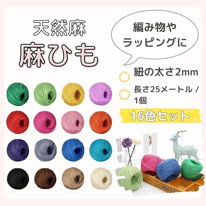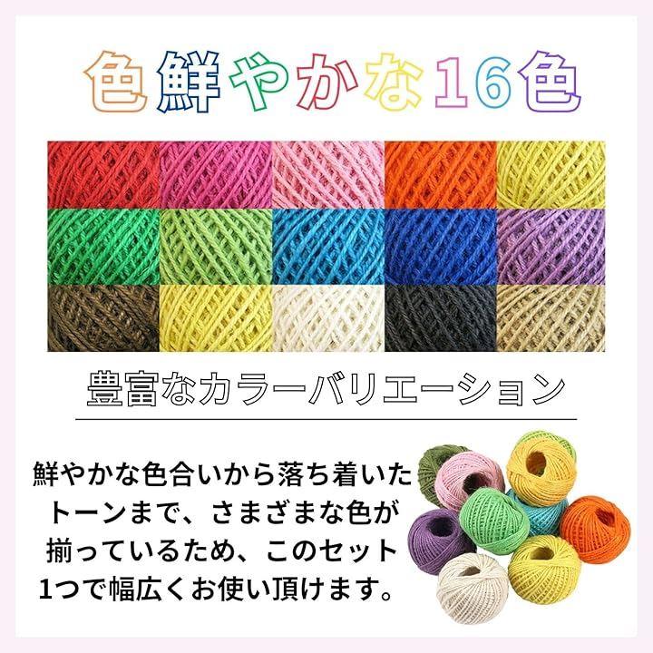 「サイズ」長さ25m/1個、太さ2mm「素材」天然麻「重量」440g 「内容」16色セット 「カラー」緑・黄緑・黄色・薄紫・赤・濃ピンク・薄ピンク・橙・紫・グレー・青・水色 ・黒・茶・ベージュ・白*取扱説明書は付属しておりません*モニターの環境により、色の見え方に若干差が生じる場合がございます。