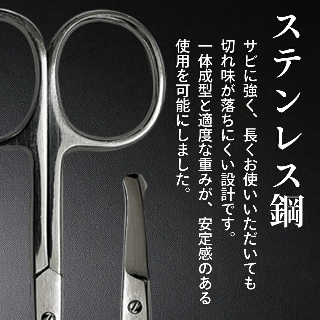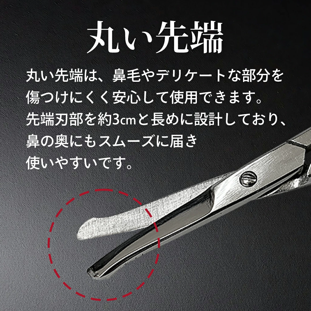 ●伝統的に、ドイツを始めヨーロッパで多く使われている鍛造鋏です。●男性の指も入りやすい大きめのハンドルに職人が1本ずつ日本人向けに切れ味の調整をした刃付けをした鋏です。●先端を丸く仕上げ、鼻毛やデリケートな部分にも使いやすい形状で、安心して使用できます。●先端刃部を約3cmと長めに設定してあり、鼻の奥にもスムーズに届き使い易く設定しております。●ステンレス鋼の使用で錆びに強く、長くお使いいただいても切れ味が落ちにくい設計です。●鍛造仕上げでハンドルから一体成型なので、安定感と適度な重みがあり使いやすい設計です。【商品名/型番】鼻毛鋏 95mm / 4571452041430【商品サイズ】全長約95mm【材質】ステンレス鋼【原産国/製造国】パキスタン/パキスタン・日本【ご使用上の注意】※お子様の手の届かない所に保管してください。※他の用途にご使用しないでください。※刃物ですので、周りの安全に気を付けてご使用ください。※空切りは刃先を傷める可能性があるのでお控えください。※長期間濡れたままにしないでください。