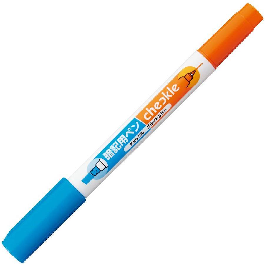 塗って覚える青色のペンと、書いて覚えるオレンジ色のペンが1つになった、1本2役の暗記用ペン「チェックル」です。