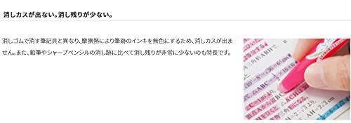 ○新開発の「蛍光フリクションインキ」搭載・蛍光色素を用いた新開発の「蛍光フリクションインキ」を搭載。このインキは、ボディ後部の専用ラバーで擦ることで発生する摩擦熱により消色設定温度に達し、インキの色が無色に変わり、筆跡を消すことができます。
