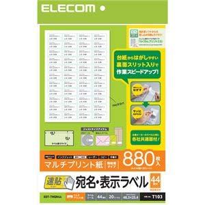 【メーカー名】エレコム 【型番】EDT-TMQN44 【ご注意事項】 ・この商品は下記内容×5セットでお届けします。 インクジェットプリンタ、レーザープリンタ、コピー機でも使用できるマルチタイプのラベル用紙です。 台紙からはがしやすく、効率よく宛名貼り作業を行える『速貼』宛名・表示ラベルです。 主要メーカーラベルと同じ各社共通面付タイプです。(44面付) ラベルを簡単にはがせる裏面スリット入りで作業効率が大幅にアップします。 手書きも可能で、手軽に宛名ラベルを作成することができます。 無料でダウンロードできるエレコムのラベル作成ソフト「らくちんプリント2.0」で、簡単にデザイン・印刷が可能です。 「らくちんプリント2.0」を使って、表計算ソフトからの差し込み印刷も簡単です。 ●用紙サイズ:幅210mm×高さ297mm ※A4サイズ ●一面サイズ:48.3mm×25.4mm ●ラベル枚数:880枚 ※20シート×44面 ●用紙タイプ:マルチプリント紙 ●カラー:ホワイト ●紙厚:0.15mm ●坪量:140g/m2 ●テストプリント用紙:テストプリント用紙