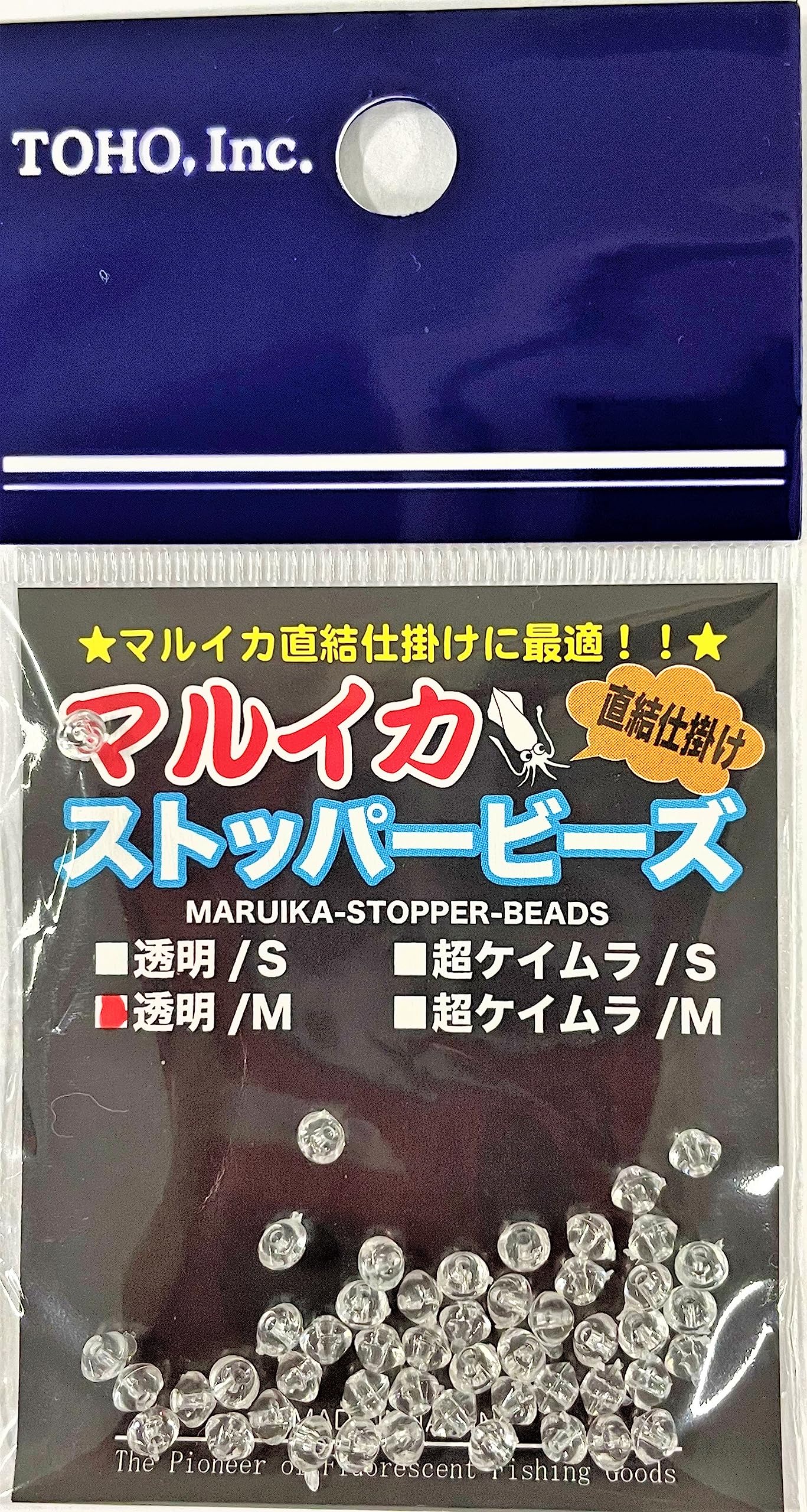 マルイカ直結仕掛けの必需品!!●直結仕掛けのストッパービーズに最適! ●スッテに合わせて選べる2サイズをご用意! ●カラーは定番の「超ケイムラ」と「透明」