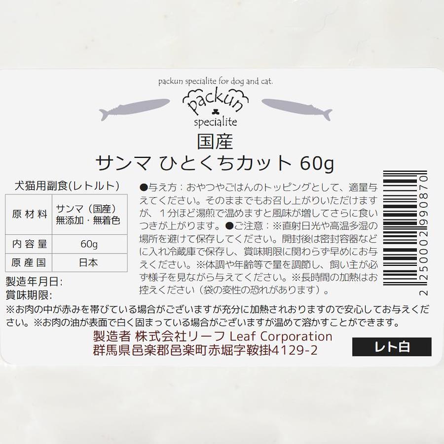 無添加・無着色・保存料不使用。レトルトで素材本来の味をお楽しみください!5袋セット国産サンマひとくちカット60g無添加無着色レトルト犬猫用PackunSpecialite対象犬・猫機能副食・おやつライフステージオールステージ(生後6ヶ月以上)特長●国産のさんまを食べやすい大きさにカットし、骨まで柔らかく仕上げました。●さんまは匂いが強く、お魚の中でも食いつきが良く、DHA・EPAを豊富に含む青魚です。●無添加・無着色・保存料不使用。加工には真水を使用し、塩分無添加、味付けはしておりませんのでさんまそのものの味を楽しめます。●そのまま食べやすいおやつとして、フードにトッピングして食いつきアップ、または手作りごはんの材料のひとつとしてなど、様々な用途でお楽しみいただけます。●無添加・無着色・保存料不使用。味付けはしておりませんので無塩です。素材本来の味をお楽しみください。内容量60g×5袋原材料サンマ(国産)原産国日本与え方●愛犬・愛猫のおやつやごはんのトッピングとして、少量与えてください。●そのままでもおいしくお召し上がりいただけますが、湯煎で人肌に温めますと、風味が増してさらに食いつきが上がります。●大きい場合は細かくほぐして与えてください。保存方法●直射日光や高温多湿の場所を避けて保存してください。●開封後は密封容器などに入れ、冷蔵庫や冷凍庫で保存し、消費期限に関わらず早めにお与えください。ご注意※6ヶ月未満の幼犬・幼猫には与えないでください。※本商品には骨が入っております。まるごと食べられるように加工しておりますが、気になる場合は取り除いてください。※袋の中の水分は素材から出たおいしいスープです。素材と一緒にお楽しみください。※天然素材なので、形・色合いに多少のバラつきがあります。※本品を与える際は、喉に詰まらせないよう様子を見ながら与えてください。※本品は保存料を使用しておりません。消費期限内でも保管状況によっては、カビが発生する場合がございます。開封後はお早めにお与えください。※当商品に使用されている原材料は不飽和脂肪酸を多く含み、猫で過剰に摂取すると健康に影響を与える恐れがあります。おやつやトッピングとして少量を与えるようにしてください。※当商品に含まれる原材料により犬・猫にアレルギーを引き起こす可能性がございます。少量から与えていただき、体調に異常がみられた際は与えるのを止めて頂き獣医師などの専門家へと相談してください。※風通しの良い、直射日光があたらない涼しいところで保管してください。※長時間の加熱はお控えください(ビニール袋の変性の恐れがあります)。