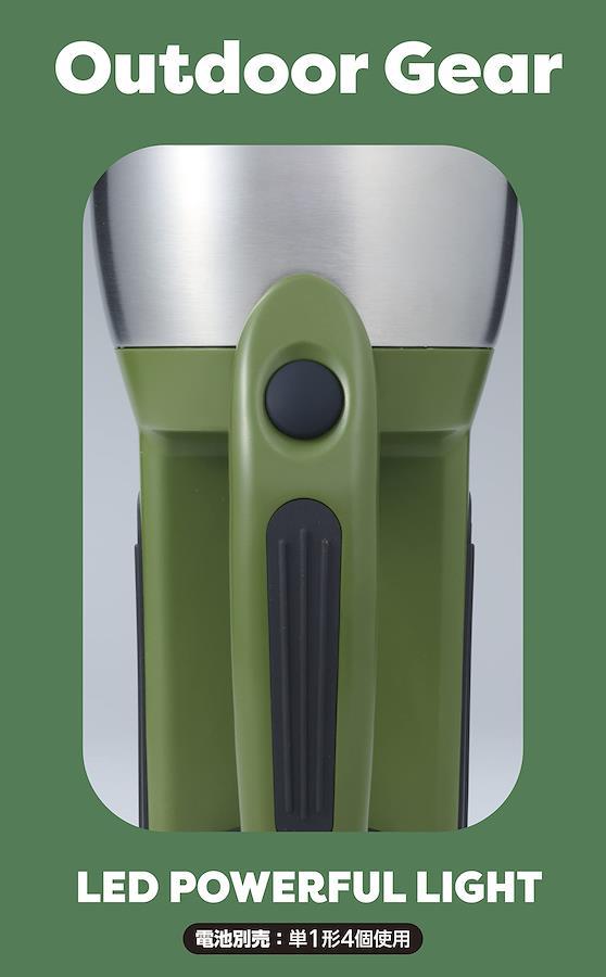 高輝度のLED光源と大口径レンズで、強力照射。雨中でも安心の防滴構造。単1形4個使用白色LED防水性能/IPX4電池寿命/約50時間光束/約190lm(電池初期時)照度/約9,000lx(1m前方/電池初期時)本体/ABS製
