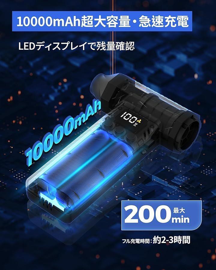 「10000mAh大容量バッテリー&急速充電可能」10000mAhの大容量リチウムバッテリーを内蔵しており、約2-3時間フル充電で最大200分使用可能で、最高回転速度では約10分の強力な暴風を持続し、各種作業の円滑な完了を支えることができます。