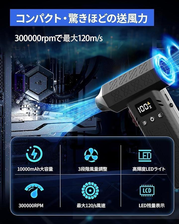 「15000Pa強力噴射と吸引が可能な1台2役」電動エアダスターと小型掃除機の2つの機能を兼ね備え、強力噴射と吸引ができる電動クリーナー。