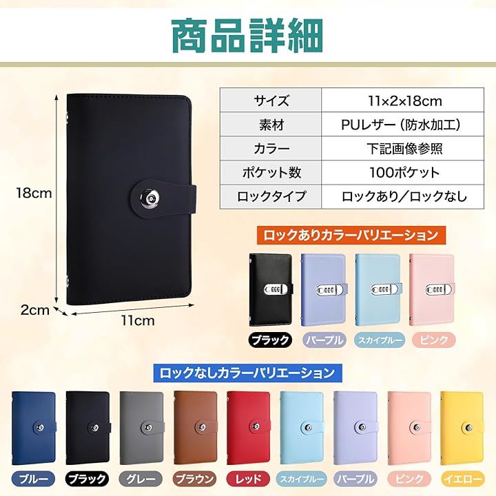 「 製品仕様/夢への第一歩 」 *セット内容:PUレザー製バインダー, 1-100番ポケット付きリフィル50枚(両面で100ポケット)。