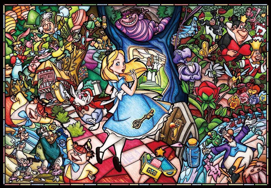アリスの物語の名シーンやキャラクターがステンドグラス調のアートに鮮やかに組み込まれた究極の絵柄!【ピュアホワイトジグソーパズル】ピースが純白! これはジグソーパズルの革命です!●感動的に美しい印刷●清潔感あふれる純白のピース●すばらしいフィット感●環境にやさしい(植物からできた「バイオマスプラスチック」を原料の一部に使用しています)