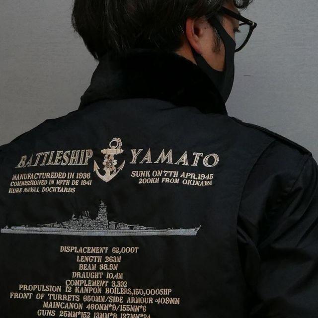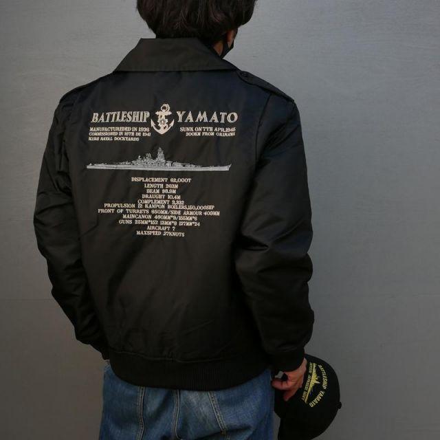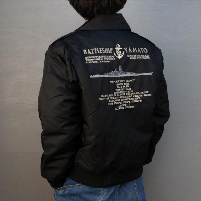 商品名:【ポイント10倍】 フライトジャケット(戦艦大和・刺繍入り)【戦艦大和グッズ】防寒着 ミリタリー アウトドア カジュアル ジャケット メンズ海上自衛隊 簡易ジャンパーをベースに背中に戦艦大和を刺繍。サイズは大き目です。取り外し可能な【襟ボア】付きです。左胸&左腕にベルクロ付きなので、お好きなパッチやネームタグを取り付けることができます。左胸:5x10cm・左腕:4x6cm※商品にワッペンは含まれません。カラー:ブラックサイズ:S/M/L/LL/3L/4L<サイズ表(仕上がり寸法)・cm>4L:胸囲145・肩幅58・着丈75・袖丈713L:胸囲140・肩幅56・着丈73・袖丈67LL:胸囲135・肩幅54・着丈71・袖丈65L:胸囲130・肩幅52・着丈69・袖丈63M:胸囲125・肩幅50・着丈67・袖丈61S:胸囲120・肩幅48・着丈65・袖丈59SS:胸囲115・肩幅46・着丈63・袖丈57<素材>表:ナイロン100%中綿:ポリエステル100%