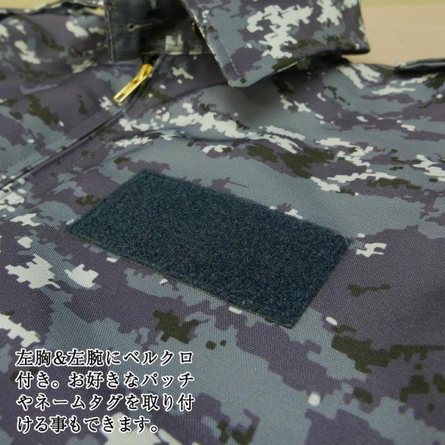 商品名:【ポイント10倍】 防寒ブルゾン(海上自衛隊デジタル迷彩柄 ★襟ボア付き ) 2か所ワッペン付(ウィングマーク・自衛艦旗) PX品 迷彩服 防寒着ミリタリー海上自衛隊デジタル迷彩柄の中綿入り防寒ブルゾンです。取り外し可能な【襟ボア】付き。左胸にウィングマーク、左腕に自衛艦旗のベルクロ&ワッペン付き。ワッペンは取り外し可能なので、お好きなワッペンに付け替えて楽しむこともできます。<ベルクロ大きさ>左胸:48mm×98mm左袖:3mm8×58mm1サイズ~2サイズ大きめの作りになっておりますのでサイズご確認の上ご注文下さい。サイズ:S/M/L/LL/3L/4L※1サイズ~2サイズ大きめの作りになっております。素材:ポリエステル100%・中綿入り<サイズ表(仕上がり寸法)・cm>4L:胸囲145・肩幅58・着丈75・袖丈713L:胸囲140・肩幅56・着丈73・袖丈67LL:胸囲135・肩幅54・着丈71・袖丈65L:胸囲130・肩幅52・着丈69・袖丈63M:胸囲125・肩幅50・着丈67・袖丈61S:胸囲120・肩幅48・着丈65・袖丈59SS:胸囲115・肩幅46・着丈63・袖丈57商品番号:g1726ss