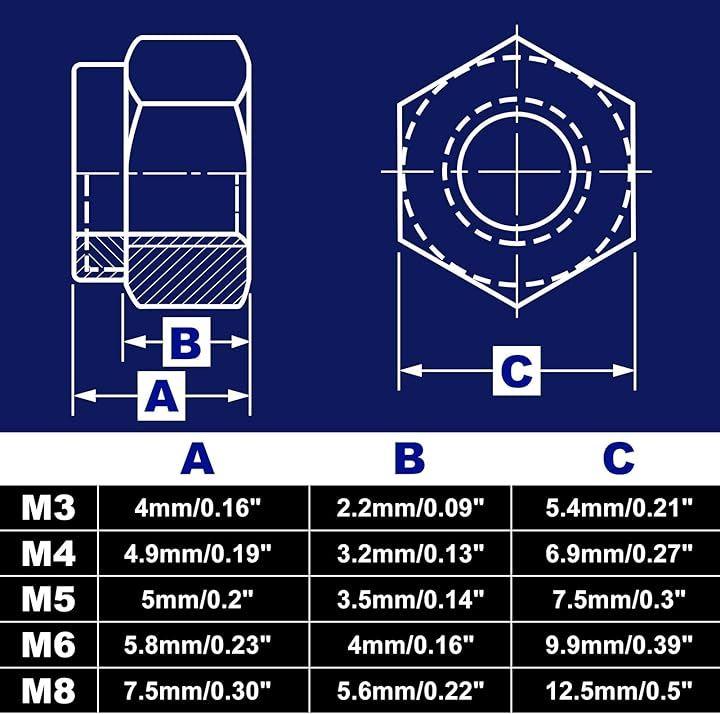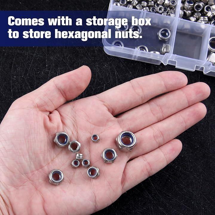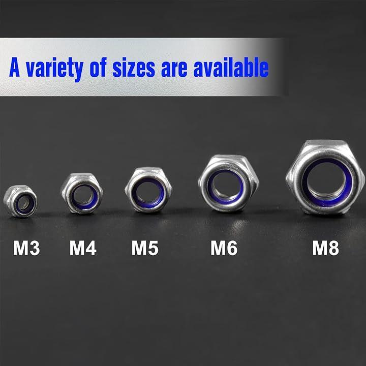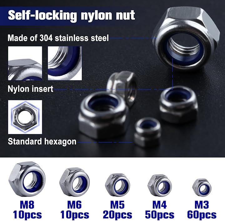 パッケージが含まれます: 60個M3六角ロックナット、50個M4六角ロックナット、20個M5六角ロックナット、10個M6六角ロックナット、10個M8六角ロックナット。