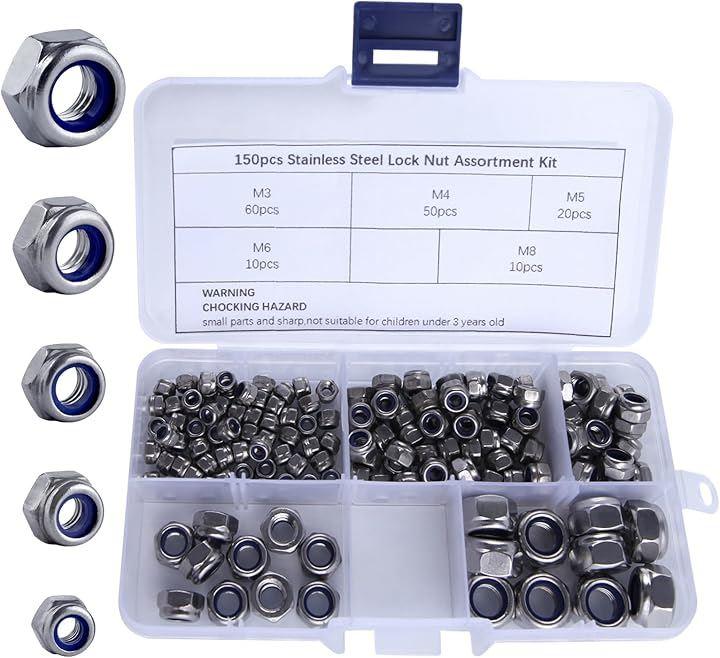 LEONTOOL 150個メトリックナイロンインサート六角ロックナット304ステンレス鋼ロックナット詰め合わせキットであなたのハードウェアプロジェクトをアップグレードします。