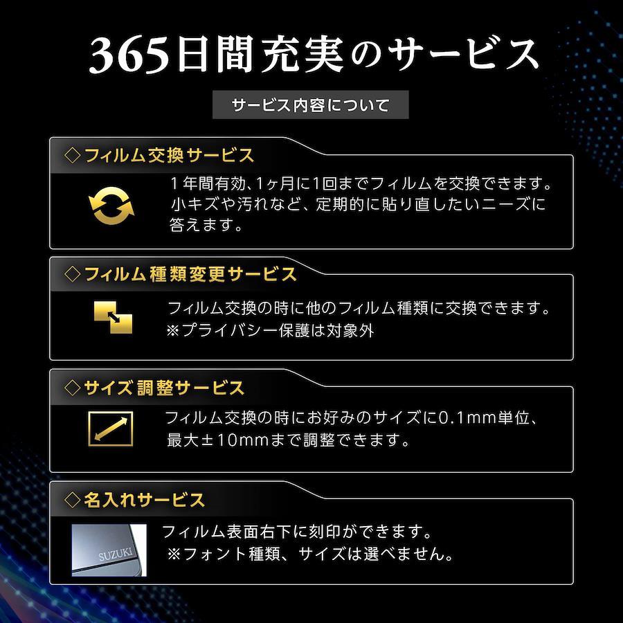 ■サービス内容についてのご説明 ●フィルム交換サービス:フィルムを複数回交換できます。(※1年間有効、1ヶ月に1回まで)●フィルム種類変更サービス:フィルム交換の時に他のフィルム種類に交換できます。(※プライバシー保護は対象外)●サイズ調整サービス:フィルム交換の時にお好みのサイズに0.1mm単位、最大±10mmまで調整できます。●名入れサービス:画面用のフィルム表面右下に刻印ができます。(※フォント種類、サイズは選べません)
