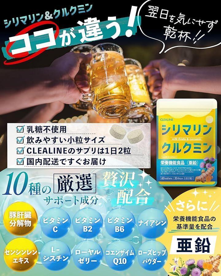 今話題のセンシンレンエキス、飲み会に欠かせない豚肝臓分解物、L-システイン、ローヤルゼリー、コエンザイムQ10、ローズヒップパウダー、ビタミン類(C, B2, B6, ナイアシン)など、10種のサポート成分をプラスした贅沢な処方です。