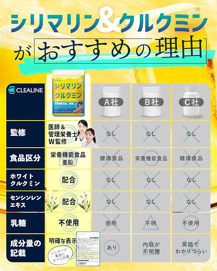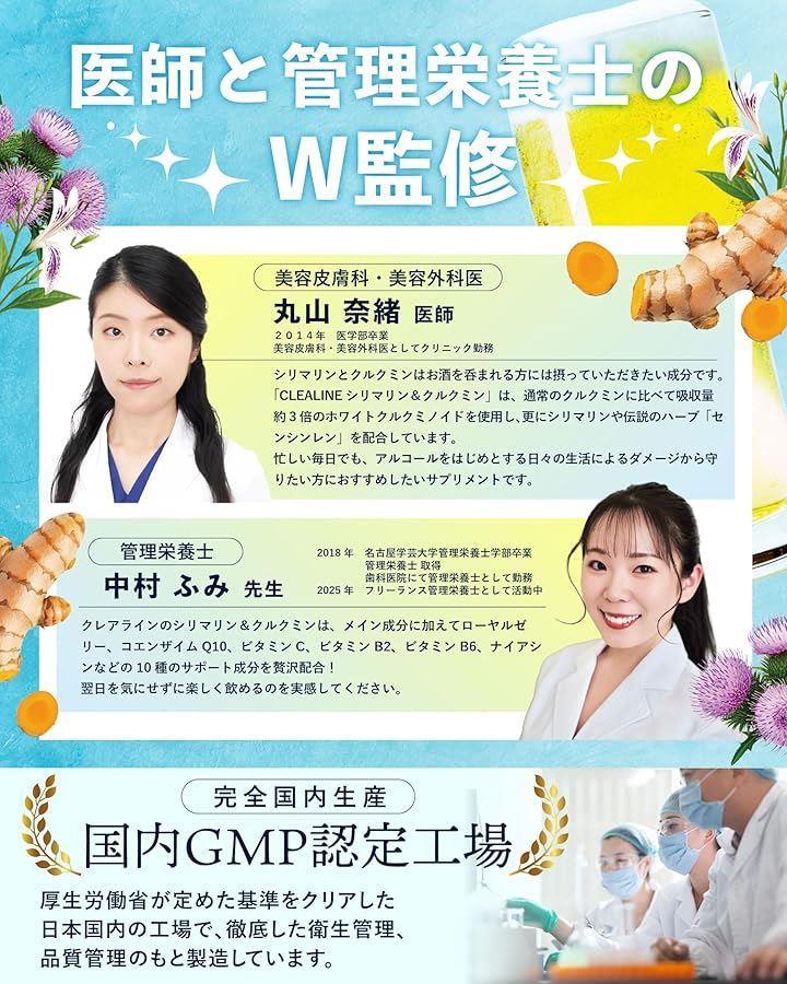 一般的なクルクミンに比べ吸収量3倍のホワイトクルクミン120mgと、シリマリン(ミルクシスル、マリアアザミエキス)100mgを贅沢に配合し、飲む人を徹底サポート。