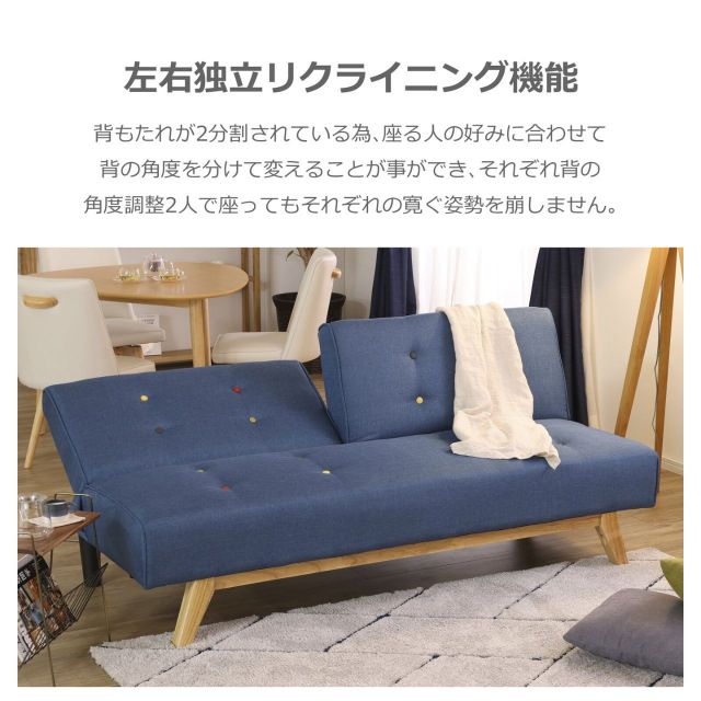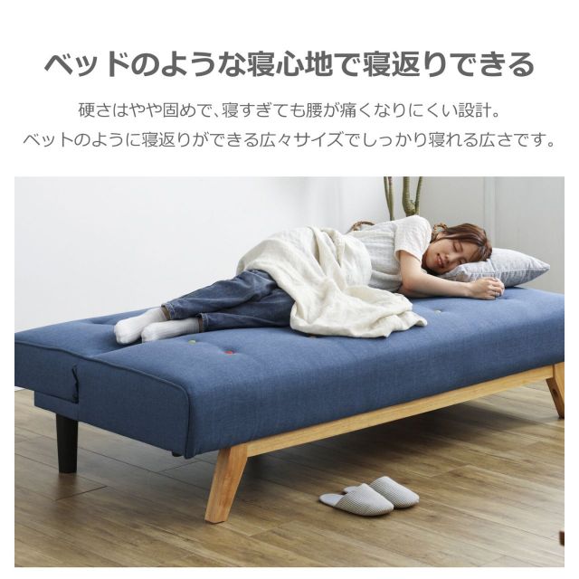 ●お部屋に彩りを添える、北欧モダンデザイン。可愛らしいマルチカラーのボタンと、さらりとしたファブリック生地が、毎日の暮らしを上質に演出します●昼はゆったりソファ、夜は広々ベッドに。シーンに合わせて姿を変える2WAYスタイルで、限られたお部屋のスペースを最大限に活用できます。●二人の理想を、これ一台で。左右別々に角度を変えられるから、読書したい時も、うたた寝したい時も、お互いのリラックスを邪魔しません。●朝までぐっすり、ベッドのような寝心地。沈み込みすぎないやや硬めのクッションが、寝返りをサポートして腰への負担を和らげます。●ソファの下まで、いつも清潔に。脚高15cmの設計だからお掃除ロボットもスムーズに通り抜け。ホコリが溜まりやすい脚元のお手入れもストレスフリーです。