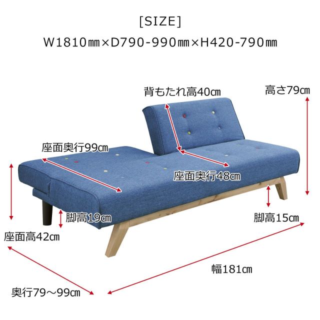 ●お部屋に彩りを添える、北欧モダンデザイン。可愛らしいマルチカラーのボタンと、さらりとしたファブリック生地が、毎日の暮らしを上質に演出します●昼はゆったりソファ、夜は広々ベッドに。シーンに合わせて姿を変える2WAYスタイルで、限られたお部屋のスペースを最大限に活用できます。●二人の理想を、これ一台で。左右別々に角度を変えられるから、読書したい時も、うたた寝したい時も、お互いのリラックスを邪魔しません。●朝までぐっすり、ベッドのような寝心地。沈み込みすぎないやや硬めのクッションが、寝返りをサポートして腰への負担を和らげます。●ソファの下まで、いつも清潔に。脚高15cmの設計だからお掃除ロボットもスムーズに通り抜け。ホコリが溜まりやすい脚元のお手入れもストレスフリーです。