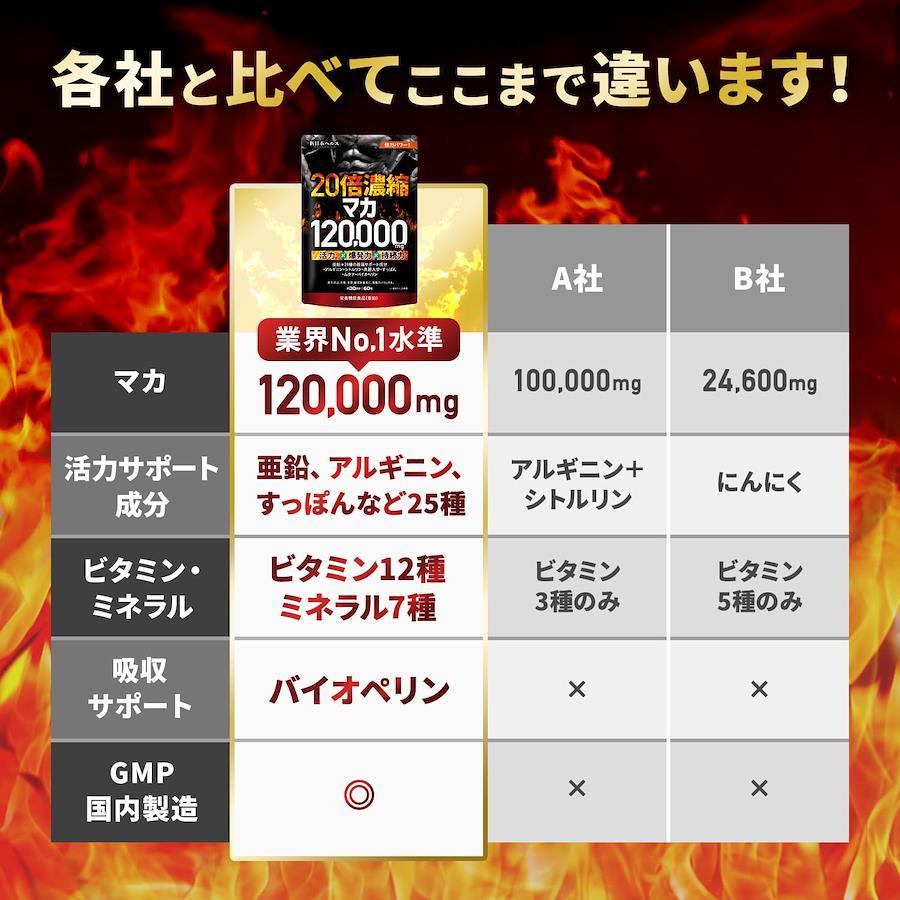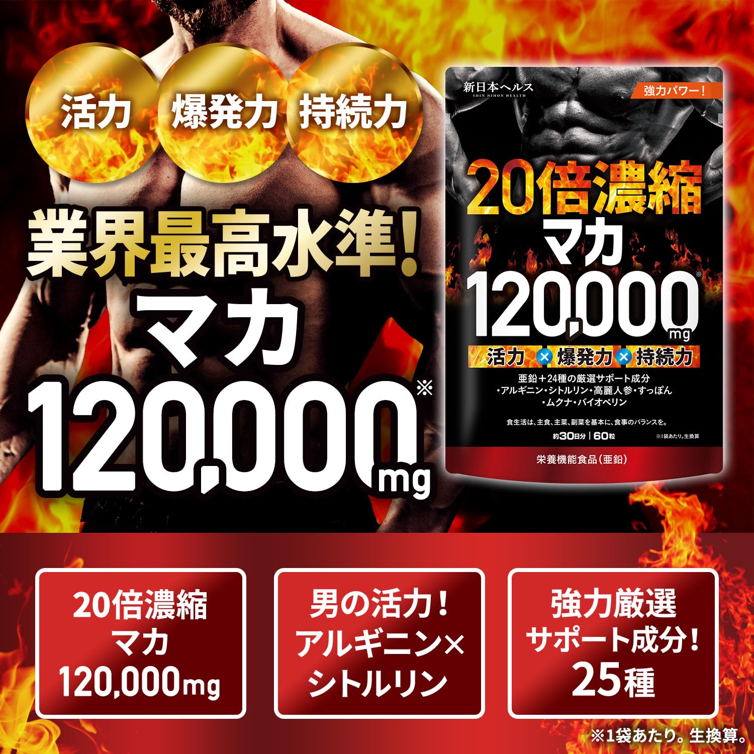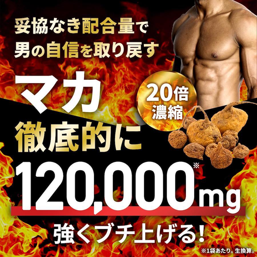 ■サイズ:??11x17.5x1.8cm;20g ??【マカ業界No.1クラス120,000mg】マカを業界トップクラスの120,000mg配合!圧倒的な配合を実感してください! ??【厳選サポート成分】亜鉛、アルギニン、シトルリン、高麗人参、すっぽんなど厳選されたサポート成分25種を配合! ??【亜鉛の栄養機能食品】栄養機能食品の基準を満たす量の亜鉛を配合!日々の活力をサポート! ??【国内GMP認定製造】安心して飲んで頂くために国内のGMP認定工場で製造! ■重要なお知らせ原材料・成分マカエキス末(マカエキス抽出物、デキストリン)(国内製造)、還元麦芽糖水飴、デキストリン、亜鉛酵母、黒胡椒抽出物、L-シトルリン、ムクナエキス末、スッポン末、高麗人参エキス末、酵母(亜鉛、マンガン、銅、ヨウ素、セレン、クロム、モリブデン含有)/セルロース、酸味料(クエン酸)、香料、ステアリン酸カルシウム、微粒酸化ケイ素、甘味料(アスパルテーム・L-フェニルアラニン化合物)、L-アルギニン、ビタミンC、ビタミンE、ナイアシン、パントテン酸カルシウム、ビタミンB1、ビタミンB2、ビタミンB6、ビタミンA、葉酸、ビタミンD3、ビタミンB12