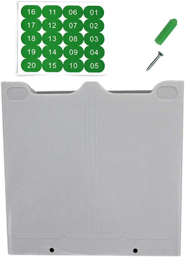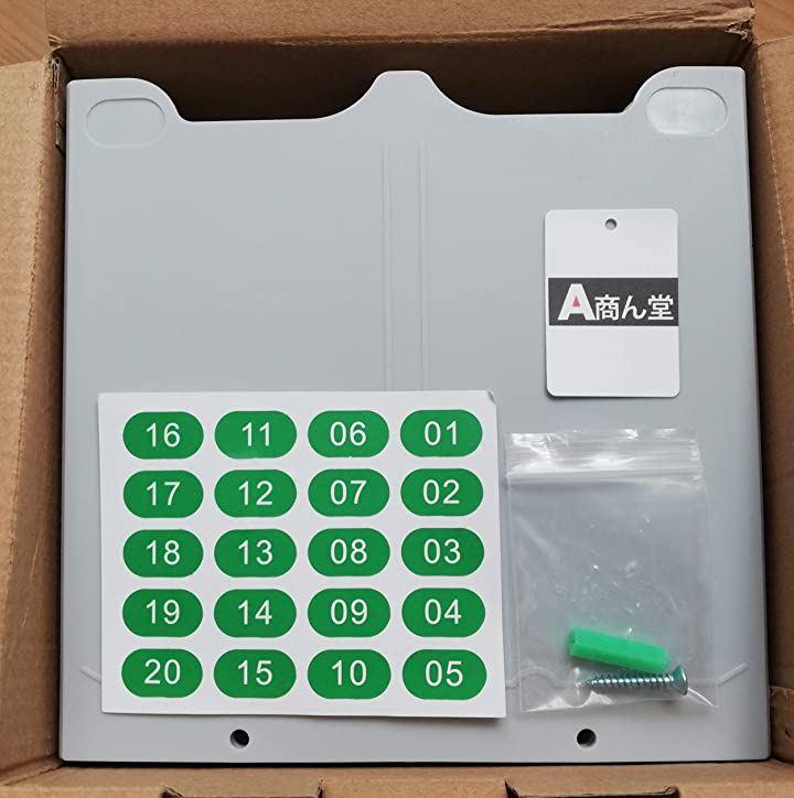 01~20まで番号を振ったシール・取り付け用のエビプラグ・木ネジが付属します。