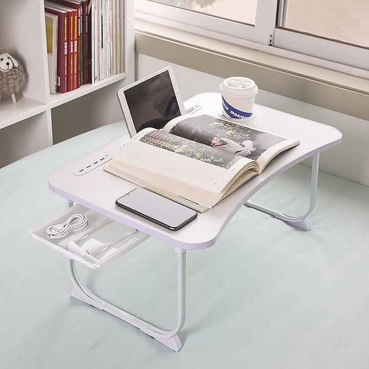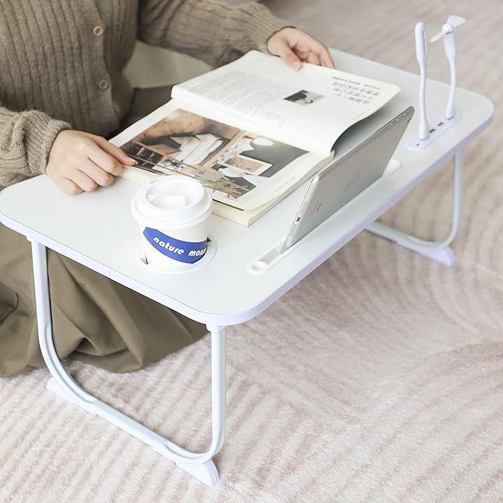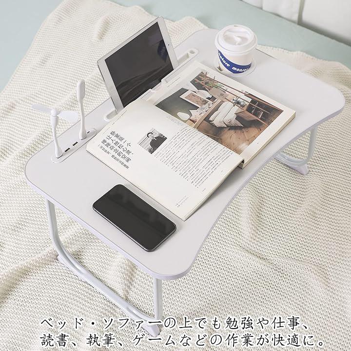 「多機能折りたたみテーブル」USB読書灯とファンが付属しています、折りたたみテ ーブルには、4*USBポート・タブレットスロット(最長辺の22CMを超えないタブレットに適用)があって、ラップトップ やスマホやタブレットに充電するのが便利です。