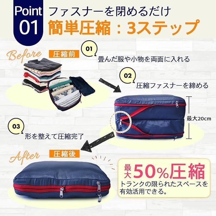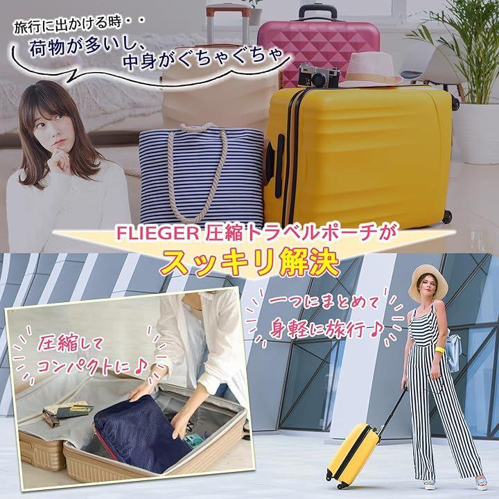「ファスナーを閉めるだけで簡単圧縮」 FLIEGERの圧縮トラベルポーチは、畳んだ衣類をスッキリ簡単に最大50%圧縮できます。
