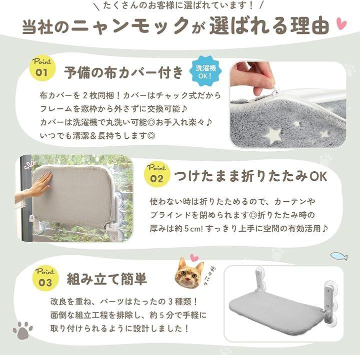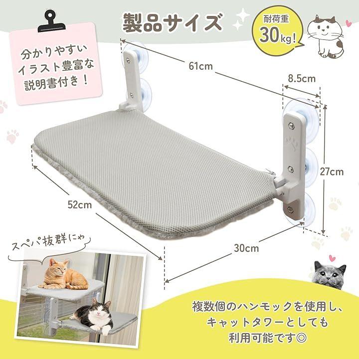 布カバーはリバーシブルになっており、片面メッシュ生地、もう片面はファー生地になっていて、1年中大活躍します。「安全・安定」強度が高く防錆性のある鉄骨パイプをハンモックの骨組みとして使用し、 直径8.5cmの大型のネジ式吸盤6つで固定するため安定性と耐久性があり、ガラスにしっかり張り付きます。