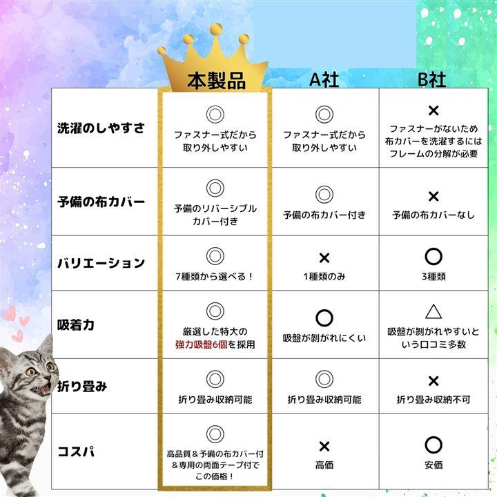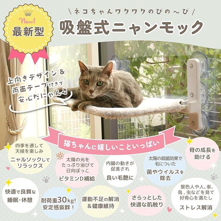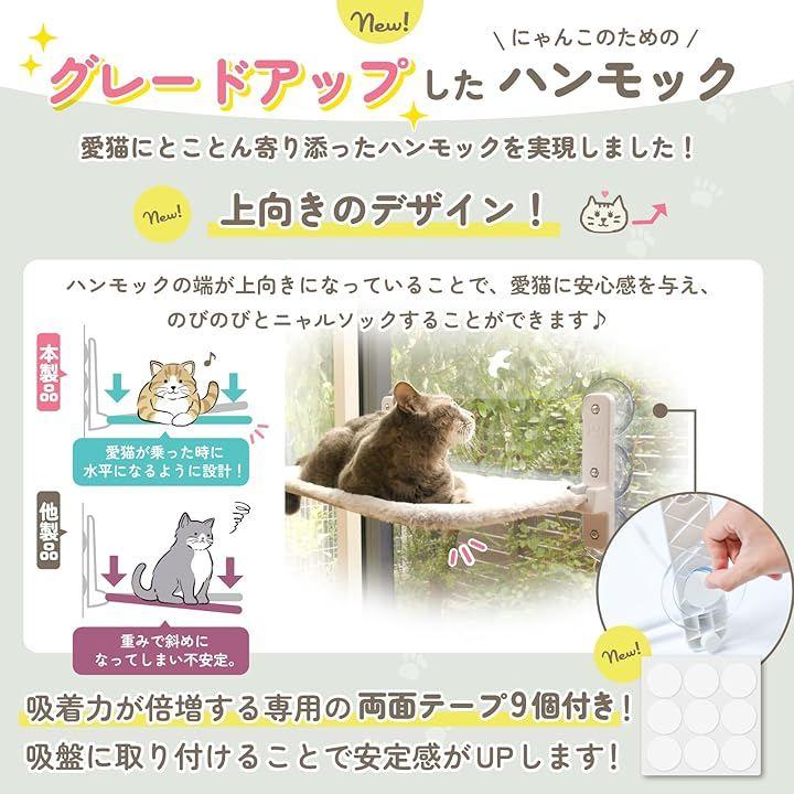 「お客様の声を元にグレードアップ。」猫ちゃんが安心してのびのびとくつろげるよう、吸盤6個で支えるデザインにグレードアップしました。また、吸盤専用の強力な両面テープ9個が付属しており、さらに安定感・安心感がアップしました。