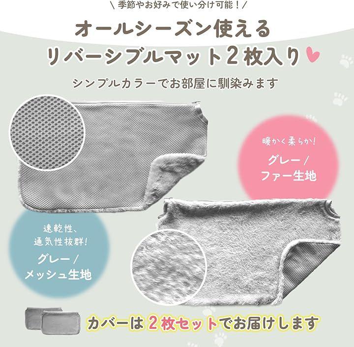 速乾性のあるメッシュ生地と暖かく柔らかい肌触りのベルベット生地の2種類があり、季節やお部屋の雰囲気、愛猫の好みに合わせて2枚お選びいただけます。