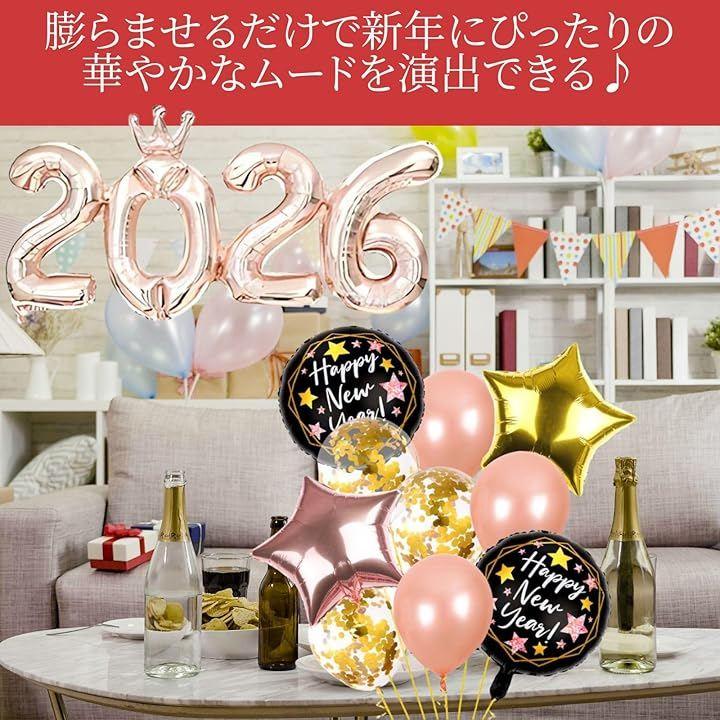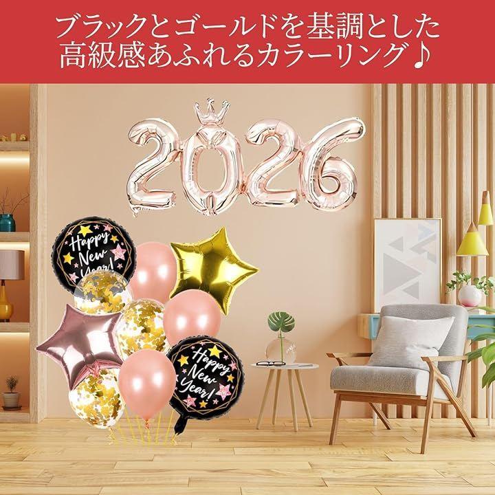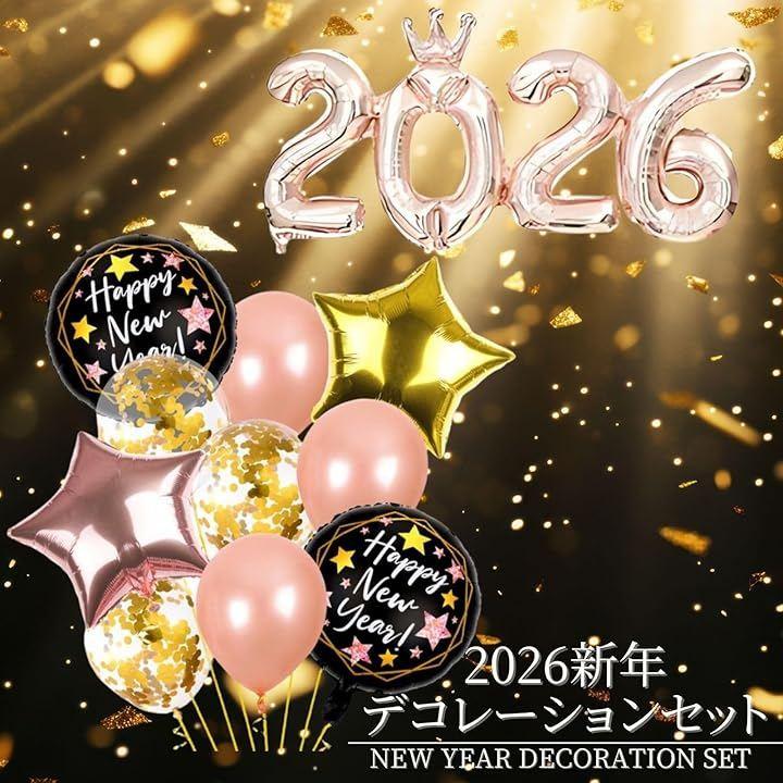 「2026新年デコレーション」珍しい数字同士がくっついている約90cmの2026バルーンと、膨らませるだけで新年にぴったりの華やかなムードを演出できるバルーン10個がついたお正月飾り付けセットです。