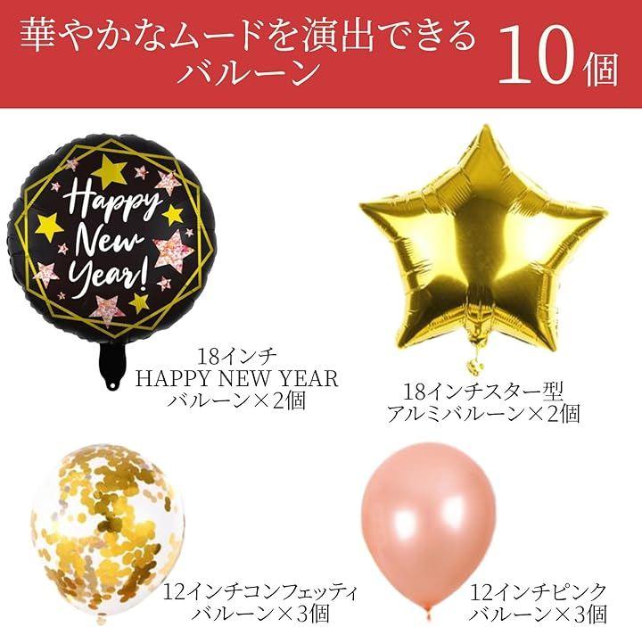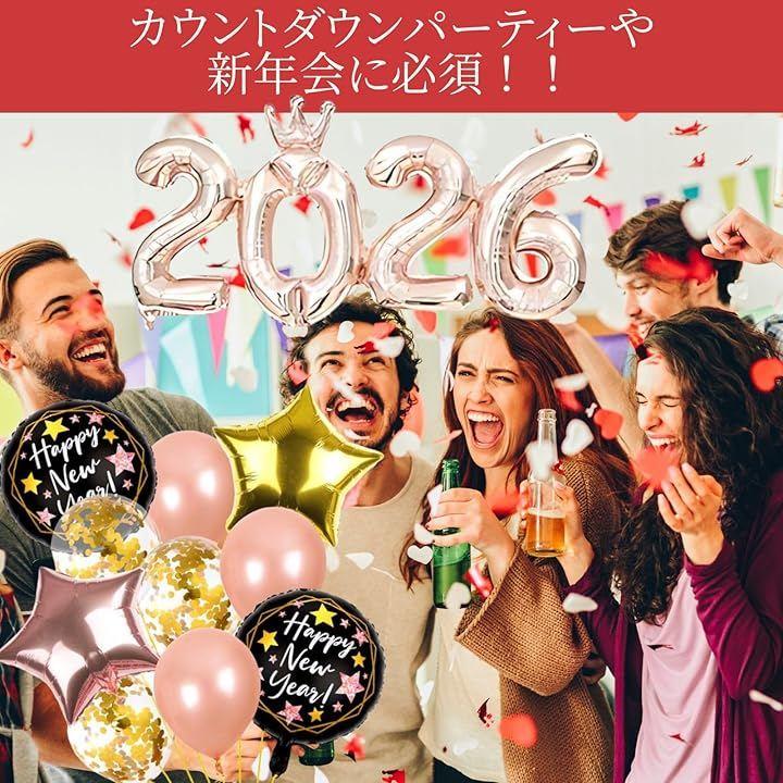 (1)「2026」数字バルーン(48x96cm)、(2)12インチコンフェッティバルーンx6個、(3)18インチスター型アルミバルーンx2個、(4)18インチHappy New Yearバルーンx2個、イメージ:写真の通りです。