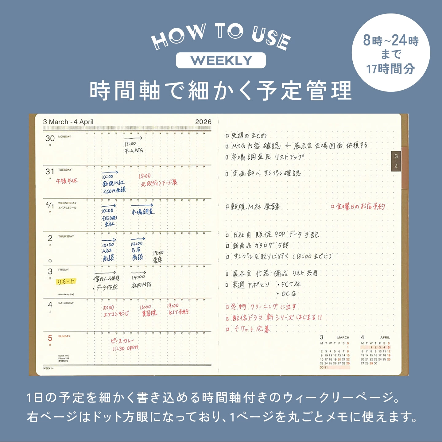 ウィークリーページはスケジュール管理しやすいレフトタイプ。左ページには8時から24時までの17時間をホリゾンタル形式で配置し、1日の予定を時間ごとに細かく書き込めます。右ページはTO DOリストやメモに便利なドット方眼スペースです。