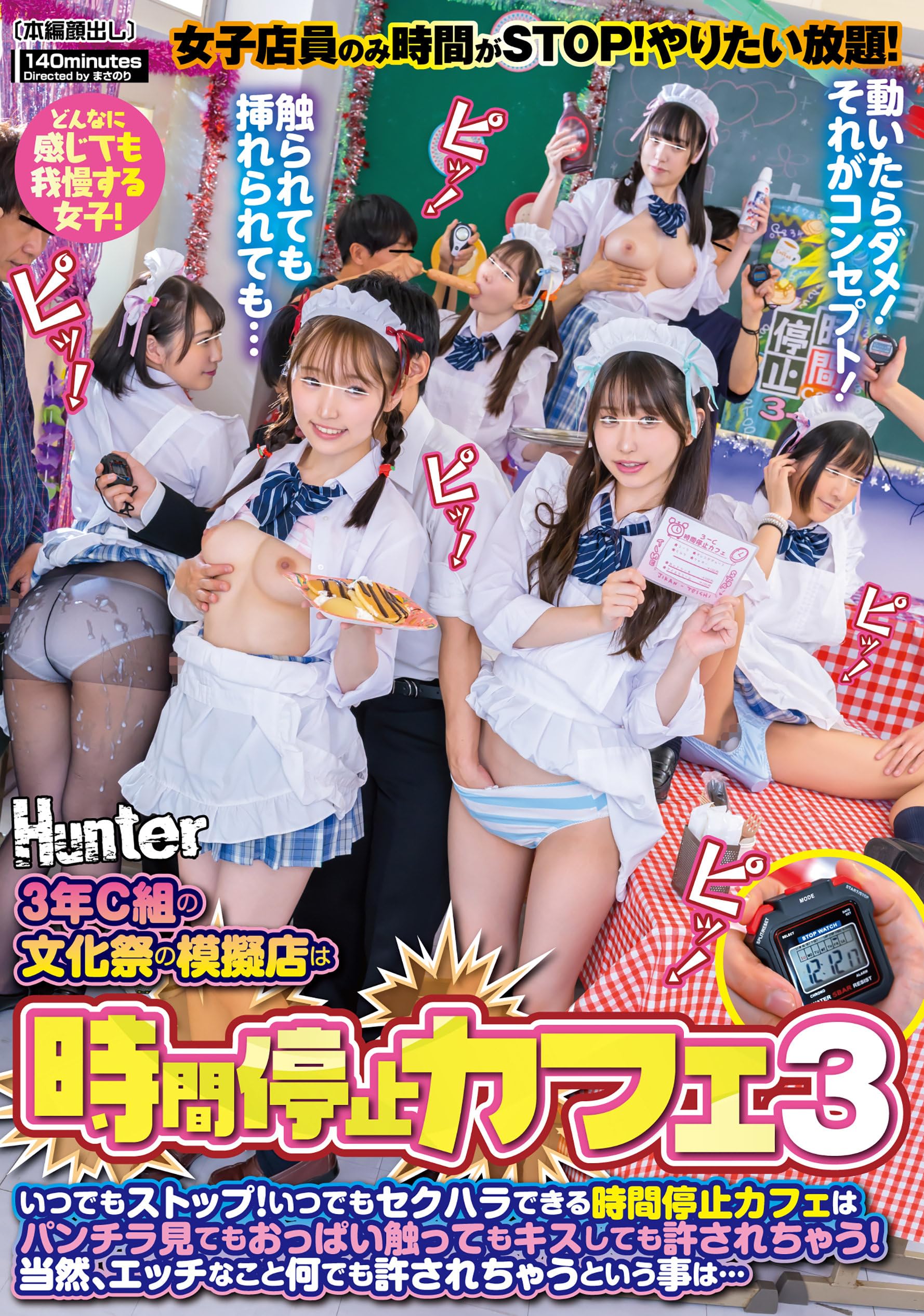 大人気の『時間停止カフェ第三弾』。ストップウォッチを押すだけでウェイトレス女子の時間を停止!もちろんあくまでも時間停止がコンセプトのカフェなので、彼女達は時間停止を全力で演じます!だからこの間はオッパイ揉まれたって、マ○コ舐められたって絶対動きません!…のはずなんだけど…。最終的には挿入までしちゃうお客さんも!でも頑張ります!コンセプトは崩しません!たとえイカされまくったとしても。