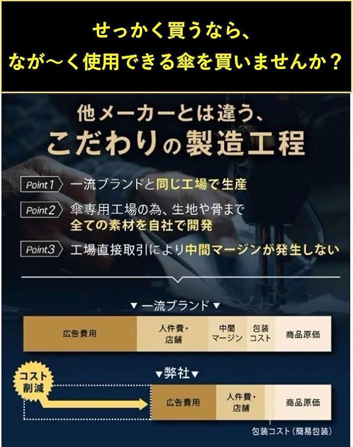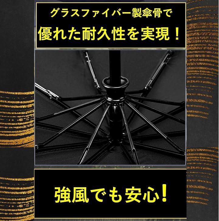 「頑丈な10本骨&耐風構造」10本のアルミニウム製の親骨、高弾力性のあるグラスファイバーを親骨先端に使用と頑丈な中棒で、耐風性能を実現。