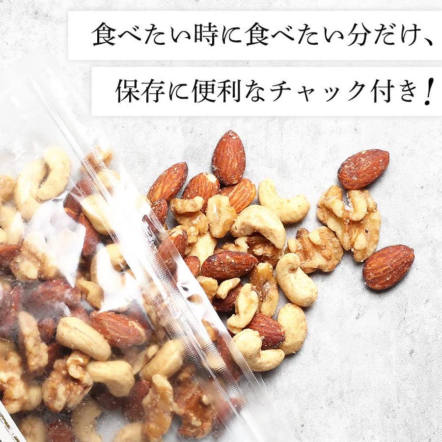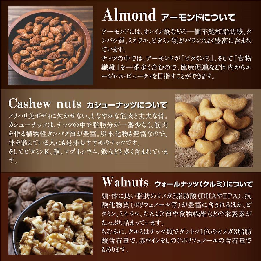 【内容量】カシューナッツ30%、アーモンド30%、ウォールナッツ(くるみ)40%の配合比率の3種ミックス。1袋たっぷり大容量の合計170g。