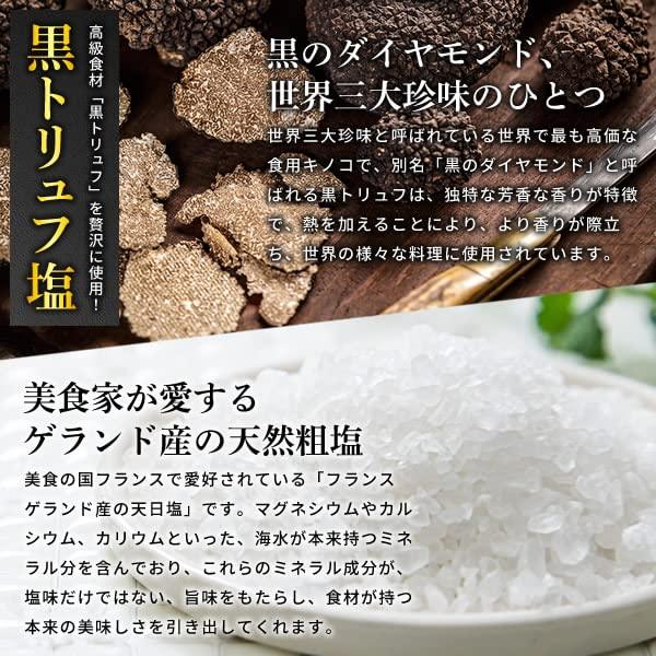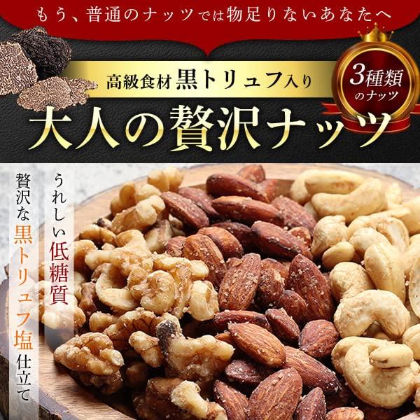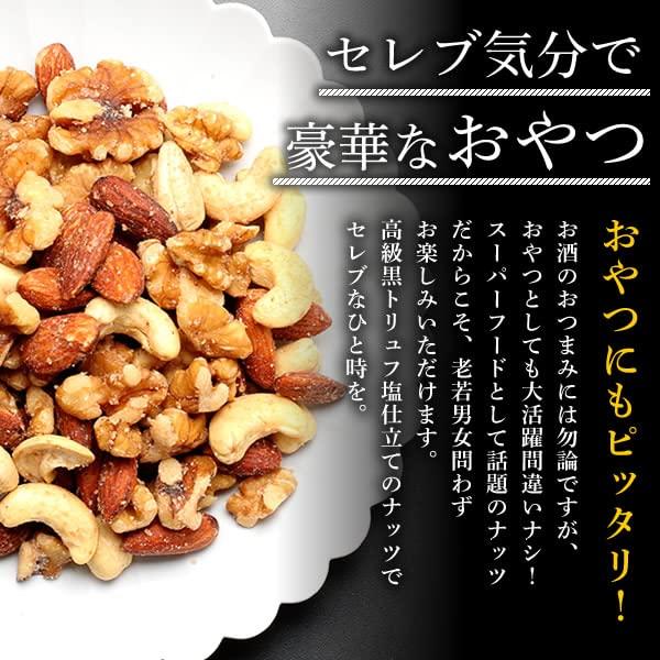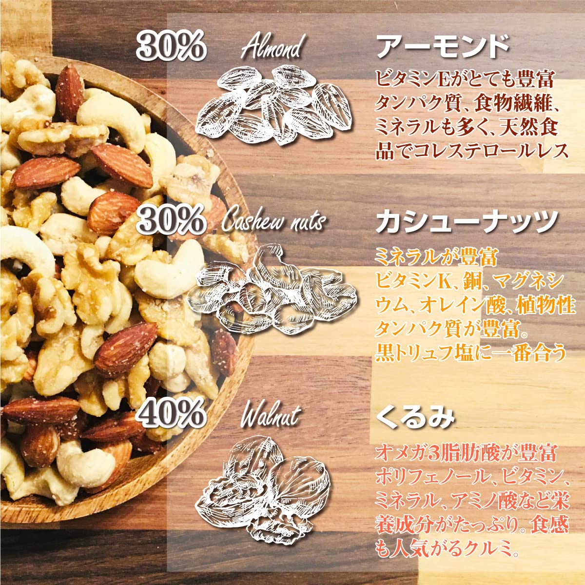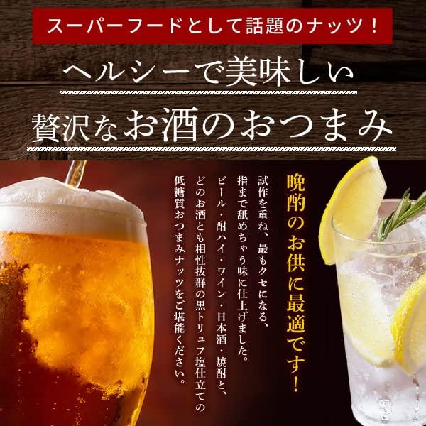 【特徴】世界で最も高級で芳醇な香りの食用キノコ『イタリア産の高級黒トリュフ(別名:黒のダイヤモンド)』と、美食の国で愛好されている『フランス・ゲランド産の天然天日塩(粗塩)』を絶妙な配合で味付けした、3種の黒トリュフ塩ミックスナッツ。 開発段階で様々なトリュフ塩ナッツを試食し、最も美味しい!と自信を持てる逸品に仕上げました。