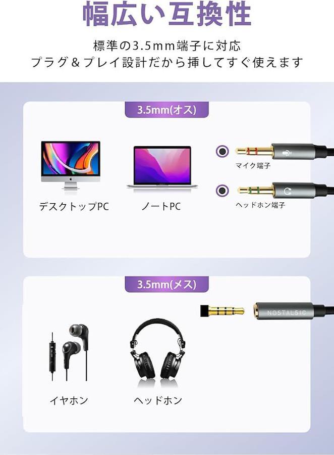 「幅広い互換性」標準の3.5mm 4極端子に対応しています。